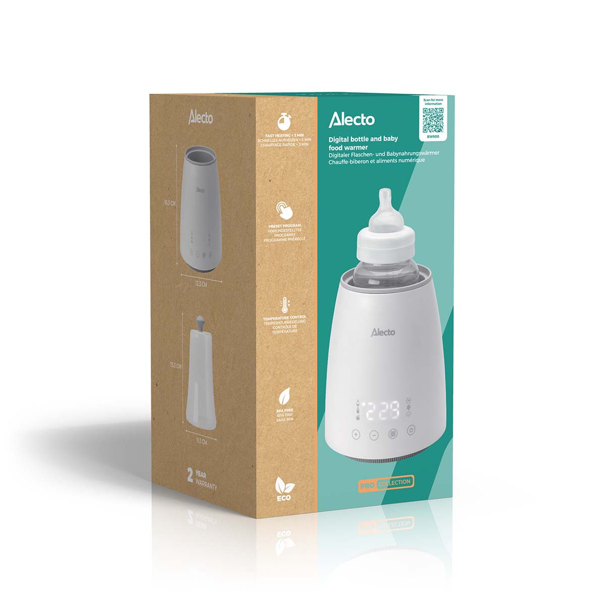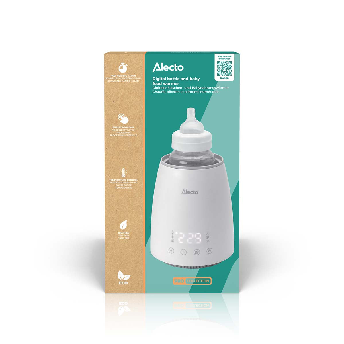 Der Alecto Baby BW900 ist ein vielseitiger Flaschen‑ und Babynahrungswärmer mit 500 W Leistung, der schnell aufheizt, auftaut und sterilisiert. Dank des gut lesbaren Displays und der voreingestellten Modi bedienst du den BW900 effizient und einfach.