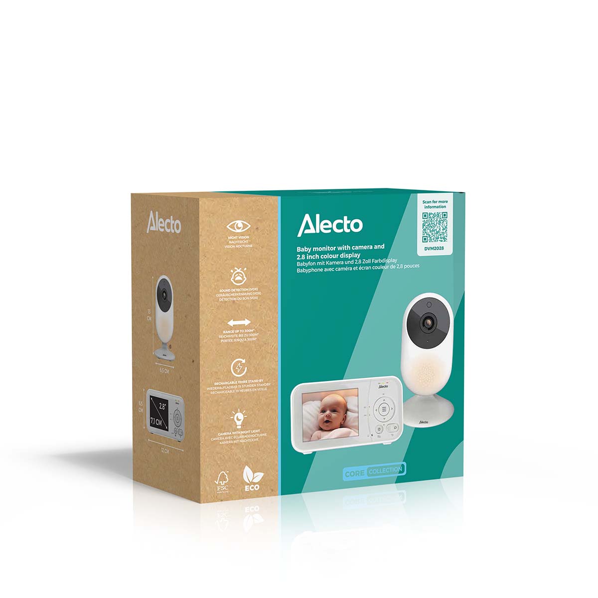 Mit dem Alecto DVM2028 genießen Sie klare Bilder auf dem 2,8-Zoll- (7,1 cm) Farbdisplay. Die Kamera kann manuell in die richtige Position gebracht werden, sodass Sie immer den perfekten Blick auf Ihr Kind haben. Dank der Infrarottechnologie sorgt die Nachtsichtfunktion dafür, dass Sie auch im Dunkeln ein klares Bild von Ihrem Baby haben. Zudem sorgt das eingebaute Nachtlicht an der Babyeinheit für ein sanftes Licht im Zimmer, was sowohl beruhigend für Ihr Kind als auch praktisch für nächtliche Kontrollen ist. Das Nachtlicht lässt sich bequem über die Elterneinheit steuern und die Lichtintensität ist einstellbar. Die 2x digitale Zoomfunktion ermöglicht es Ihnen, Ihr Kind im Detail zu betrachten, ohne die Kamera zu bewegen.