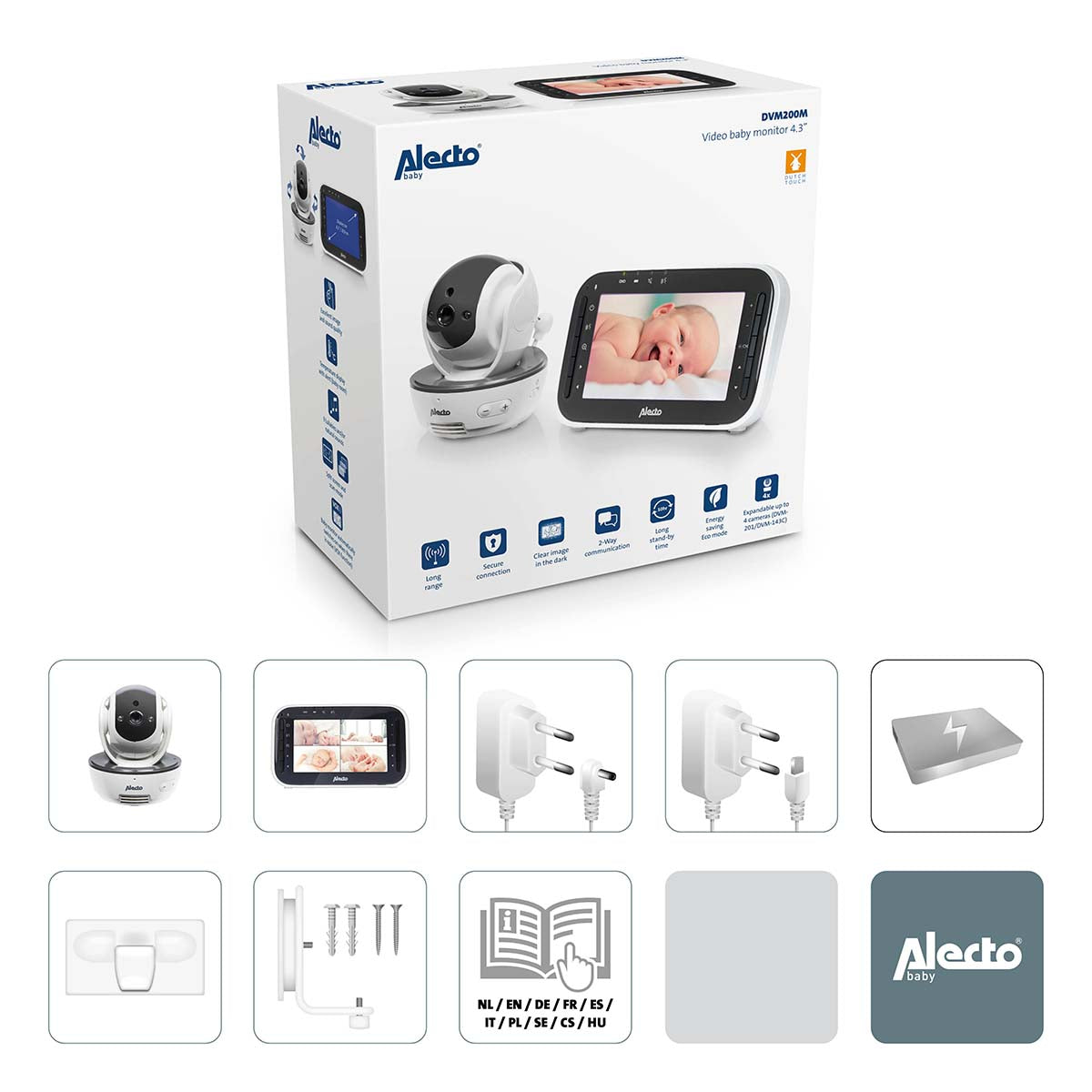 Das Alecto Baby DVM200MGS ist ein Babyphone mit Kamera und mit einer hervorragenden Bild- und Tonqualität. Die Babyphone der DVM-200-Serie gehören seit Jahren zu den meistverkauften Babyphonen. Mit dem DVM200 können Sie Ihr Baby über die kabellose, wiederaufladbare Elterneinheit natürlich immer hören und sehen. Auf dem großen 4,3 Zoll / 10,9 cm Farbbildschirm können Sie sofort sehen, was im Kinderzimmer vor sich geht. Und das alles über die Babyeinheit, die ferngesteuerte Kamera mit kristallklarem Ton und klarem Bild, und das nicht nur bei Tag, sondern auch in der Nacht. Insgesamt können bis zu 4 Kameras an die Elterneinheit angeschlossen werden (DVM200C). Neben den grundlegenden Funktionen verfügt dieses Babyphone über viele Zusatzfunktionen, die es zu einem vollausgestatteten Gerät machen.
