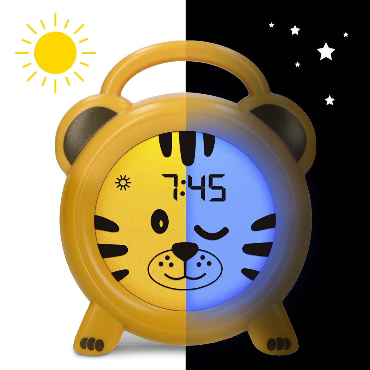 Als Mutter oder Vater stellen Sie am BC100 Sleep Timer eine Zeit ein, die Sie für das Aufstehen für geeignet halten. Sie stellen den Schlaftrainer im Schlafzimmer Ihres Kindes auf, wo es ihn gut sehen kann. Das Display ist nachts blau und zeigt auch den Mond an. Dies ist ein Zeichen für Ihr Kind, im Bett zu bleiben. Wurde die von Ihnen festgelegte Zeit erreicht? Dann springt der BC100 Schlaftrainer auf ein orangefarbenes Display, das eine Sonne zeigt. Zeit zum Aufstehen! Auf diese Weise können Sie jedem Kind - auch wenn es noch keine Uhr stellen kann - beibringen, länger im Bett zu bleiben und Ihnen mehr Schlaf zu geben.