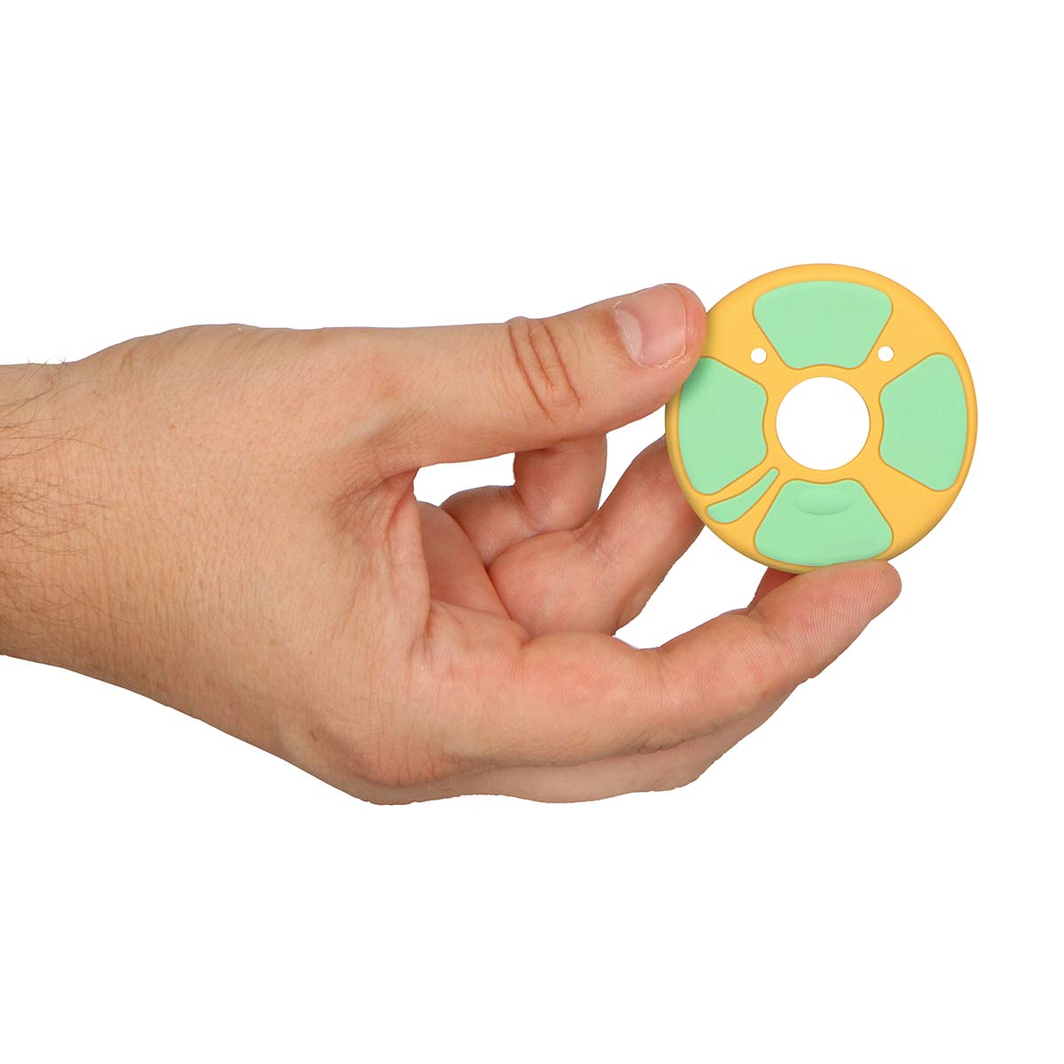 Der Alecto Baby HeeHee-Sprechknopf wird mit 3 lustigen Silikonhüllen (vierblättriges Kleeblatt, Blume und Sonne) geliefert, von denen Sie eine über dem Knopf anbringen. Das mitgelieferte Klettband macht es einfach, den Knopf an einem Kuscheltier anzubringen und auch wieder abzunehmen. Es gibt genügend Klettbänder, um den Knopf an bis zu 3 Stofftieren zu befestigen. Laden Sie die kostenlose HeeHee-App für Android und iOS herunter und installieren Sie sie. Vergewissern Sie sich, dass Bluetooth® eingeschaltet ist, und stellen Sie mit dem Knopf eine Verbindung her. Wählen Sie Ihre bevorzugte Sprache (Niederländisch, Englisch, Deutsch, Französisch, Spanisch, Dänisch, Norwegisch und Schwedisch) und das Wunder kann beginnen.
