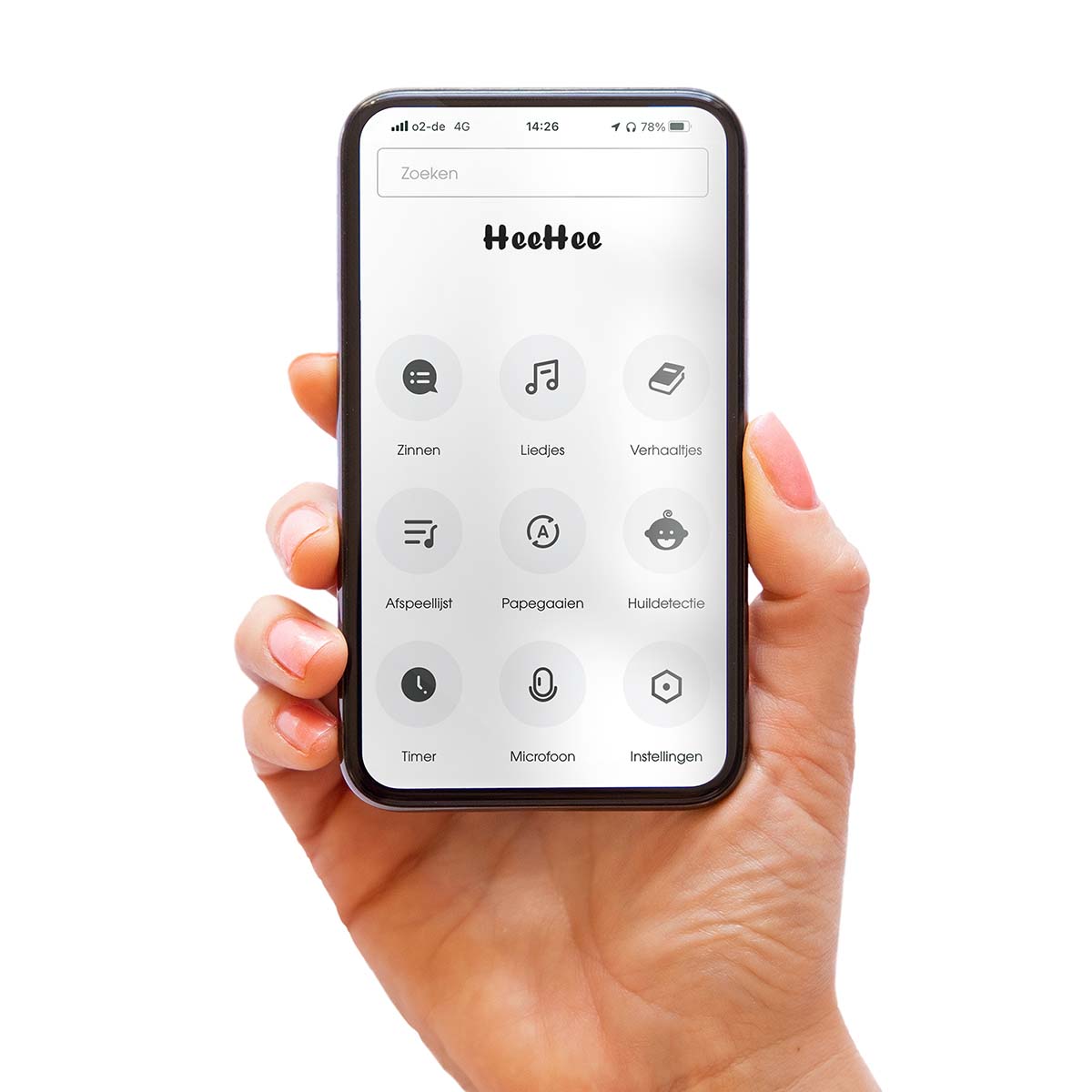 Der HeeHee kann nicht nur Töne abspielen, sondern auch aufnehmen. Sie können es so einstellen, dass sobald der Lautsprecher einen Ton erkennt, Sie in der HeeHee-App eine Benachrichtigung erhalten. Auf diese Weise werden Sie informiert, wenn Ihr Baby aufwacht. Mit der Geräuscherkennung, auch als Schreierkennung bekannt, ist es auch möglich, automatisch Schlaflieder zu starten, damit Ihr Baby wieder einschlafen kann.