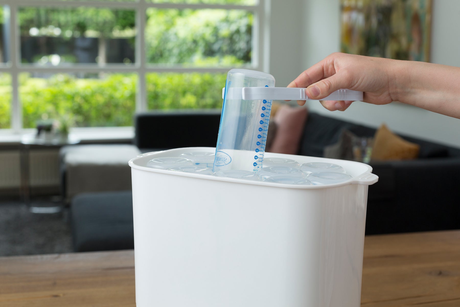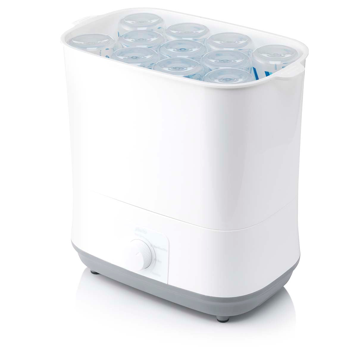 Der elektrische Dampfsterilisator kann auch von Eltern mit sehr hungrigen Babys genutzt werden: Der Reiniger sterilisiert selbst die großen 330-Milliliter-Flaschen und ist sowohl für Standard- als auch für Weithals-Babyflaschen geeignet. Auch gut zu wissen: Diese enorme Leistung geht nicht auf Kosten des Designs. Der Dampfreiniger hat eine praktische 3-in-1-Modulbauweise und ist in der Größe verstellbar. Sie haben für einen Moment vergessen, dass Sie den Dampfsterilisator eingeschaltet hatten? Kein Problem. Sobald das Programm beendet ist, schaltet sich das System automatisch aus.