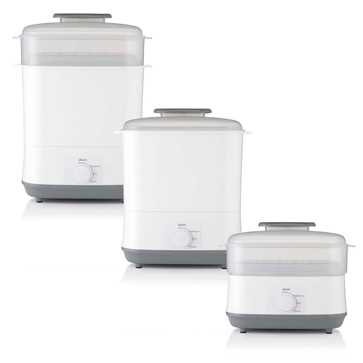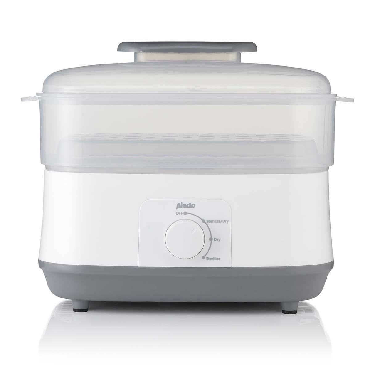 Der Dampfsterilisator verfügt über drei Programme: Sterilisieren, Trocknen, & Sterilisieren und Trocknen. Er reinigt Babyflaschen, Sauger, Löffel, Milchpumpen und Zubehör und bietet nach dem Sterilisations- bzw. Trocknungsprogramm eine sterile Aufbewahrung für 24 Stunden. Außerdem ist das Produkt komplett BPA-frei und lässt sich leicht bedienen und reinigen. Der Alecto BF55 Elektrische-Dampfsterilisator mit Trocknungsfunktion wird mit einem Messbecher und einer Zange geliefert, so dass Sie sich auch hier als frischgebackene Eltern keine Sorgen machen müssen!