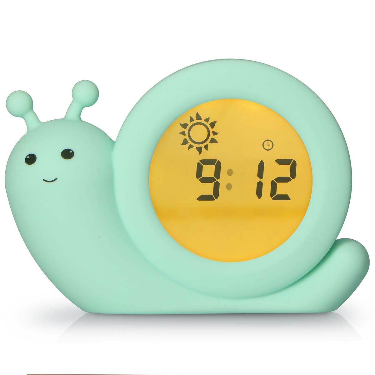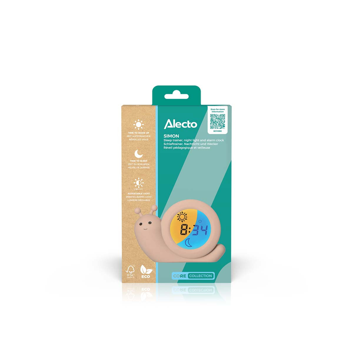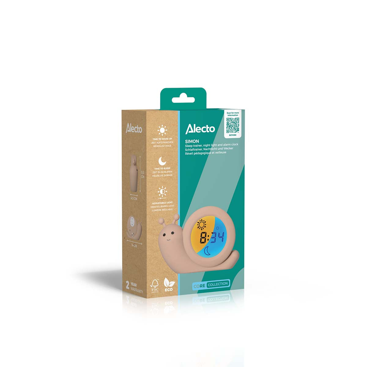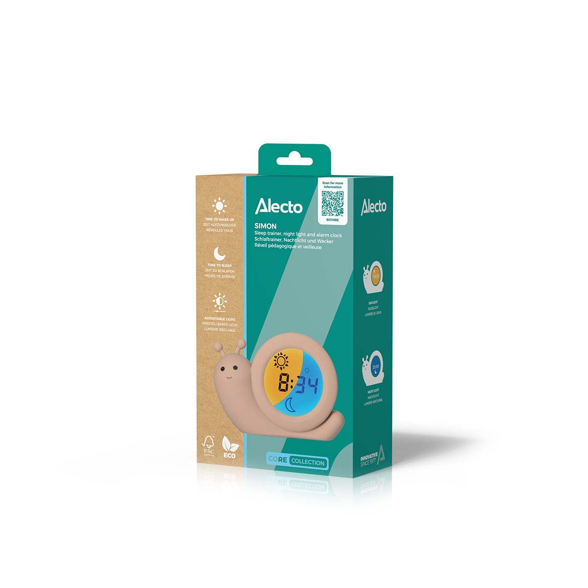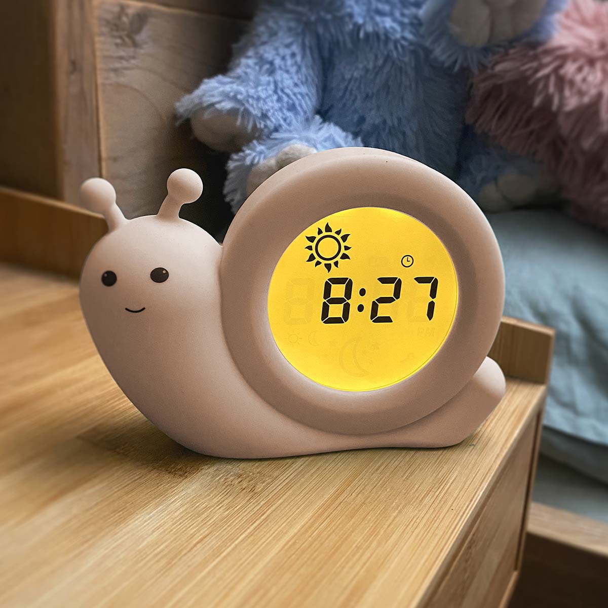 Der BC110BE SIMON von Alecto Baby ist ein 3-in-1-Schlaftrainer, Wecker und Nachtlicht in einem. Und das in Form einer freundlichen kleinen Schnecke namens Simon. Dieser Schlaftrainer hilft kleineren Kindern, ein Zeitbewusstsein zu entwickeln. Als Elternteil legen Sie fest, wann es Zeit ist, aufzustehen. Das Display ist blau und zeigt einen Mond. Das eindeutige Zeichen, im Bett zu bleiben. Ist es schon Zeit, aufzustehen? Das Display des BC110BE SIMON wechselt auf Orange und zeigt eine Sonne. Der BC110BE SIMON wird mit einem extralangen Ladekabel (200 cm) geliefert, abgesehen davon ist er aber auch wiederaufladbar und damit ortsunabhängig und benötigt kein Kabel.