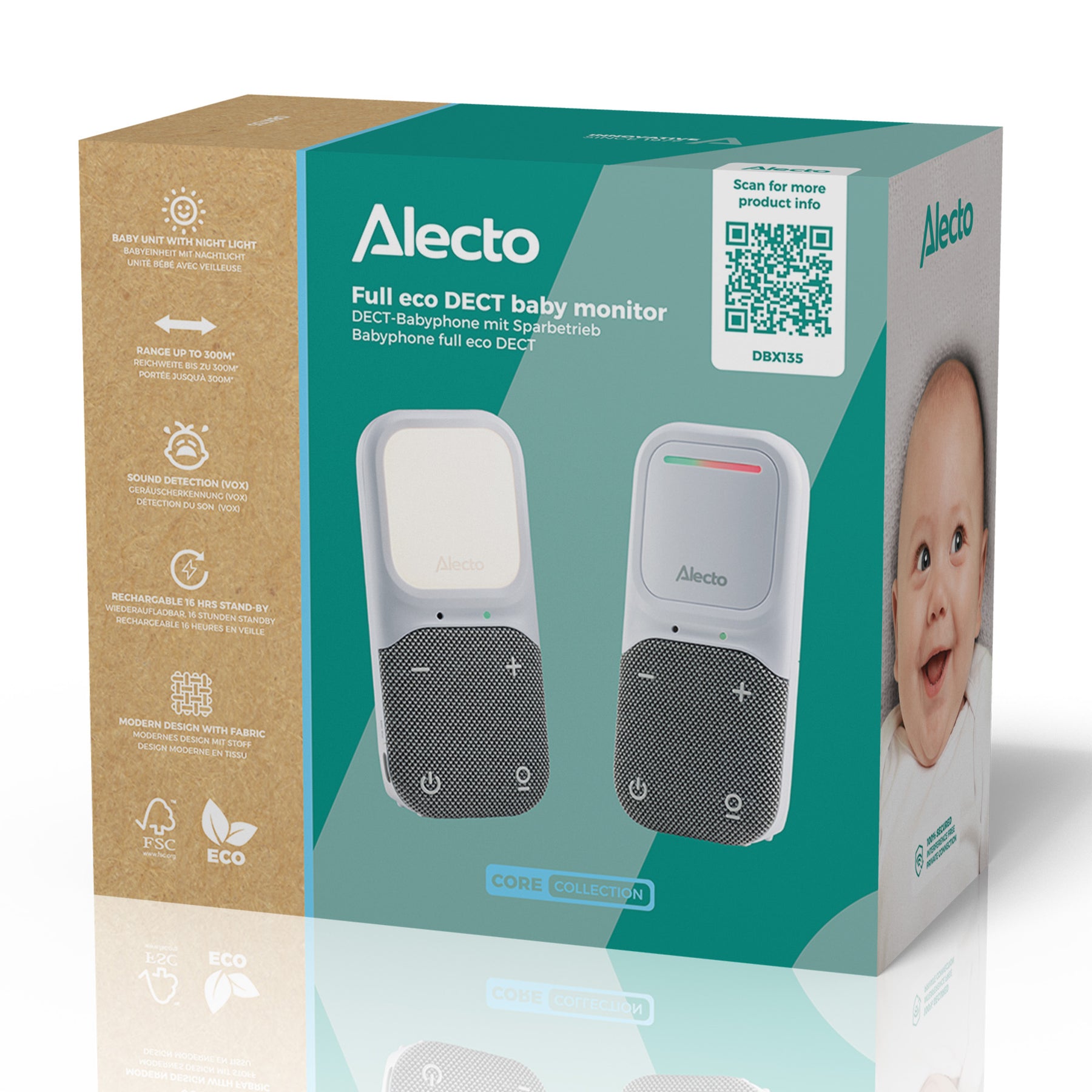 Mit dem DBX135 aus der neuesten Serie von Audio-Babyphones von Alecto holen Sie sich ein zuverlässiges, modernes und vielseitiges Babyphone ins Haus, das mit allen Annehmlichkeiten ausgestattet ist. Dieses Full Eco DECT-Babyphone bietet Ihnen als Eltern nicht nur eine kristallklare Klangqualität, sondern auch vollkommene Ruhe dank der 100 % störungsfreien und sicheren Verbindung. Ob Sie sich im Garten oder auf einer anderen Etage des Hauses befinden – mit der langen Standby-Zeit und der großen Reichweite des Alecto DBX135 bleiben Sie immer mit Ihrem Baby verbunden. Das moderne Design mit Stoff fügt sich perfekt in jedes Interieur ein, während der praktische LED-Farbindikator Ihnen auf einen Blick den Geräuschpegel im Kinderzimmer anzeigt. Außerdem kann die Empfindlichkeit des Mikrofons der Babyeinheit individuell angepasst werden. Das Nachtlicht der Babyeinheit spendet genau genug Licht, um Ihr Baby nachts zu überprüfen, ohne den Schlaf zu stören. Kurz gesagt: Mit dem Alecto DBX135 entscheiden Sie sich für ein Produkt von ausgezeichneter Qualität zu einem attraktiven Preis.
