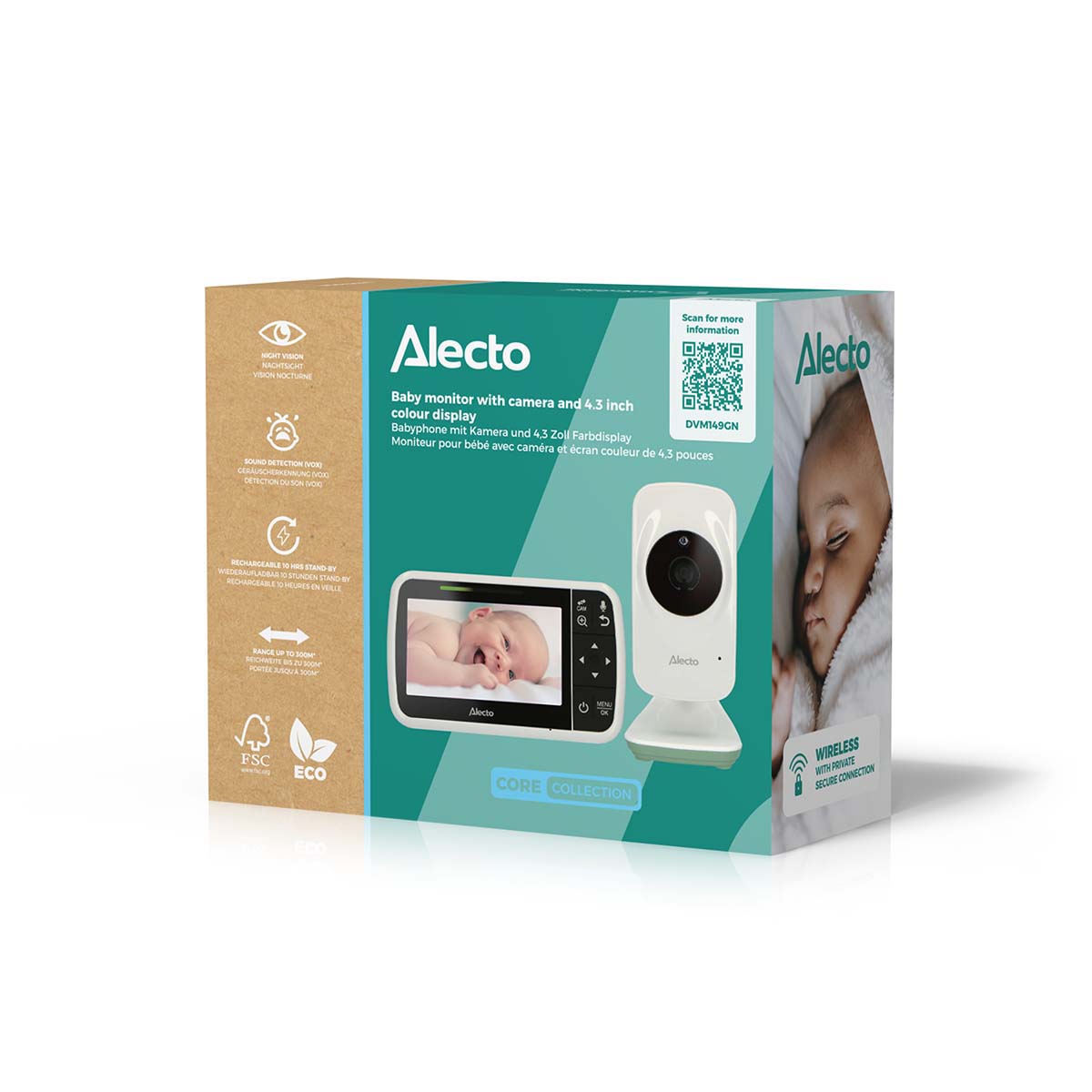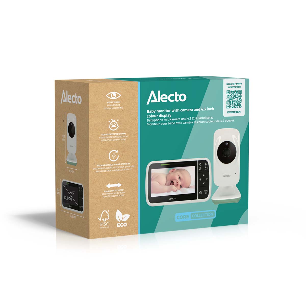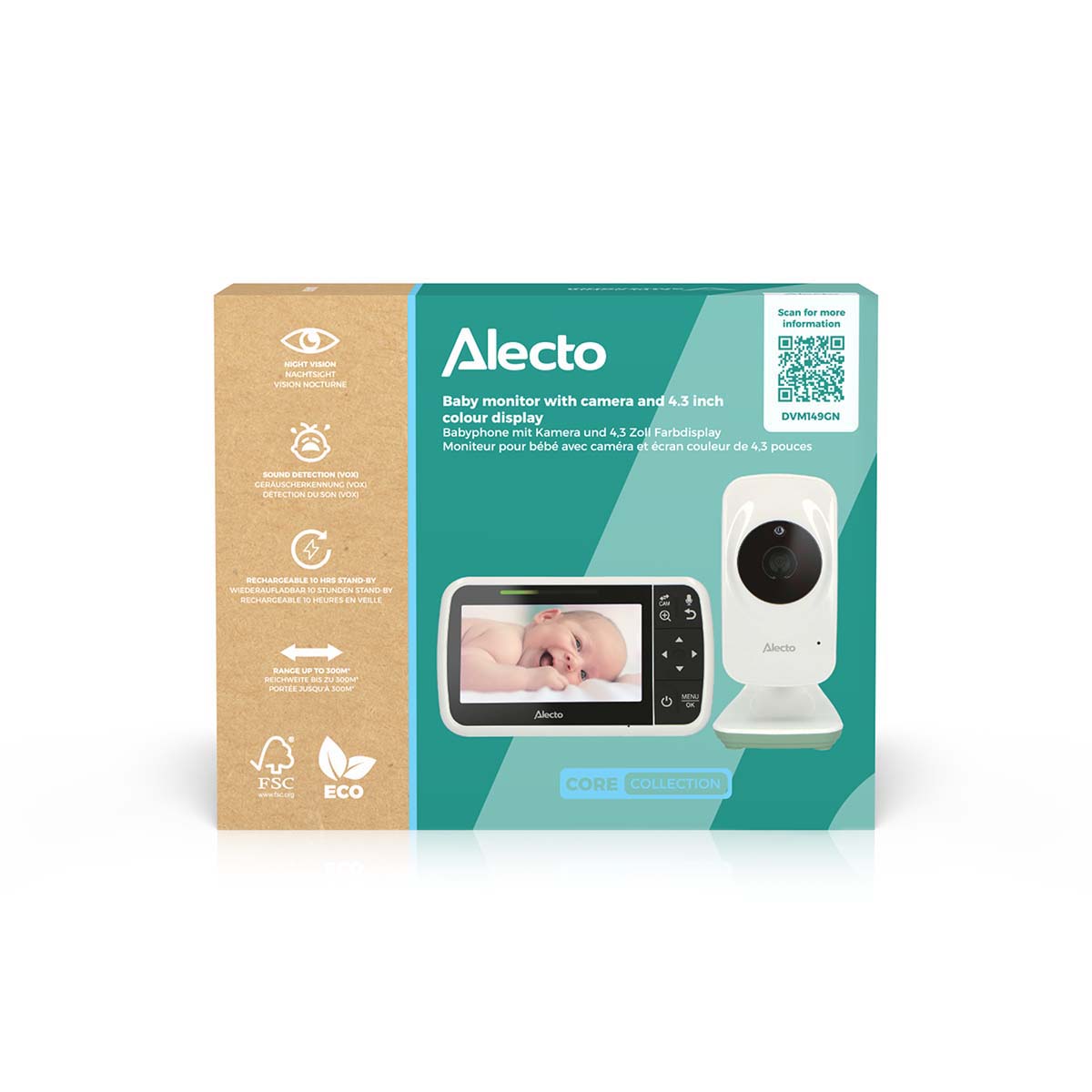 Mit dem DVM149GN Babyphone mit Kamera von Alecto Baby haben Sie Ihr Kind immer im Blick. Diese Babyphone bestehen aus einer Kamera und einem großen 4,3-Zoll-Bildschirm, verfügen über einen energiesparenden Full-Eco-Modus und sind in einem eleganten Weiß/Mintgrün gehalten.